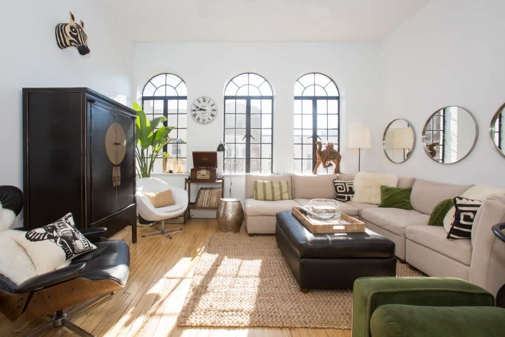 Interior Designer Jeanette Andamasaris transformed a blank canvas into a sophisticated and intriguing oasis that sits above the Downtown Mall in Charlottesville, Virginia. Light streams in through the oversized arched windows and illuminates the entire expanse of the open floor plan. Andamasaris’ furniture arrangement results in a living area that beckons for cocktails and intimate soirées.