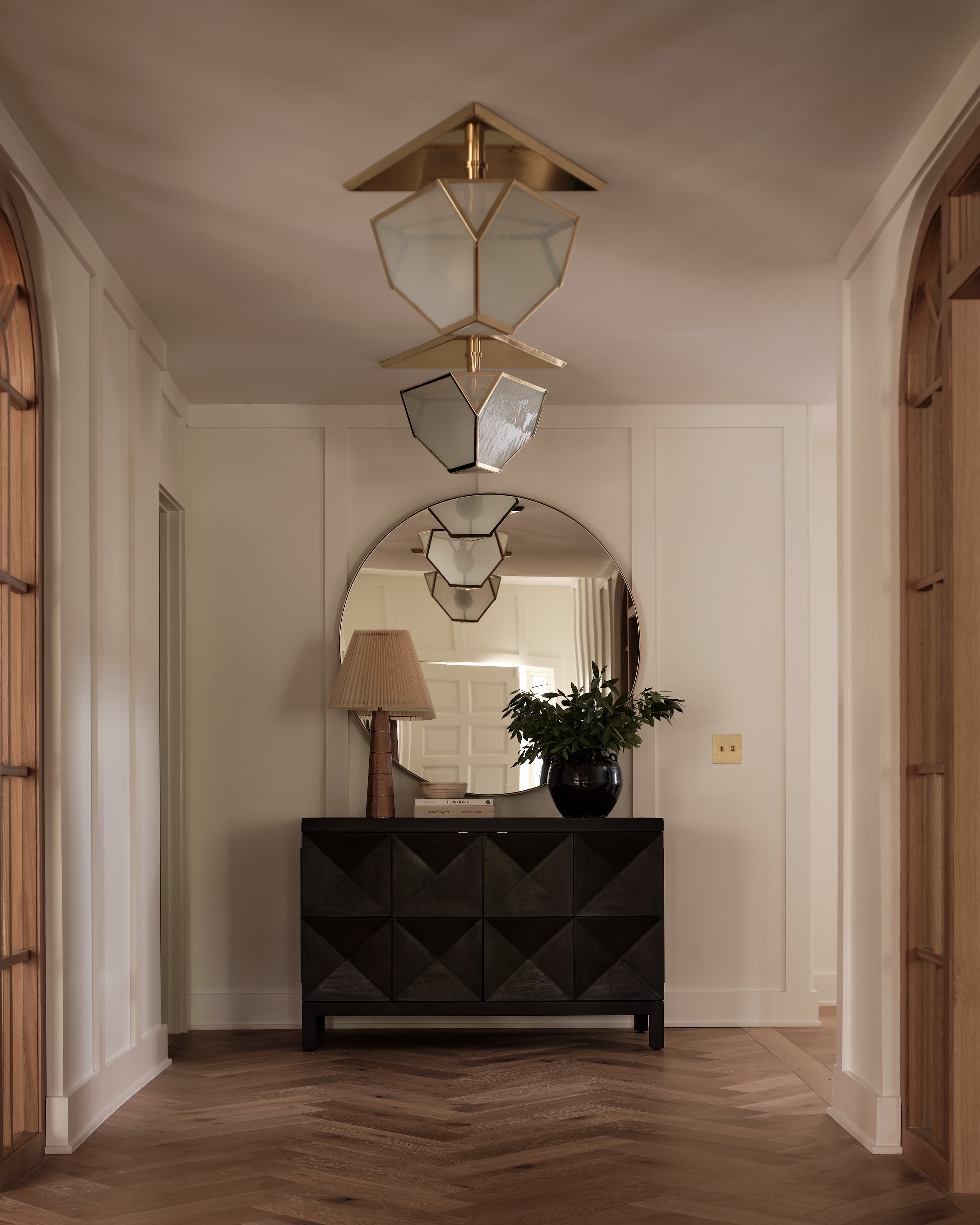 As you enter the home, you are greeted by a long hallway, referred to as the atrium, with white oak herringbone floors, stunning wooden archways that lead to the living room and the dining room, and three angular brass and glass milk light fixtures. “It was a great opportunity to create something cool, a special moment,” says Zajac. A geometric black console sets anchor at the end of the walkway, with a round mirror above to reflect the light through the space.
