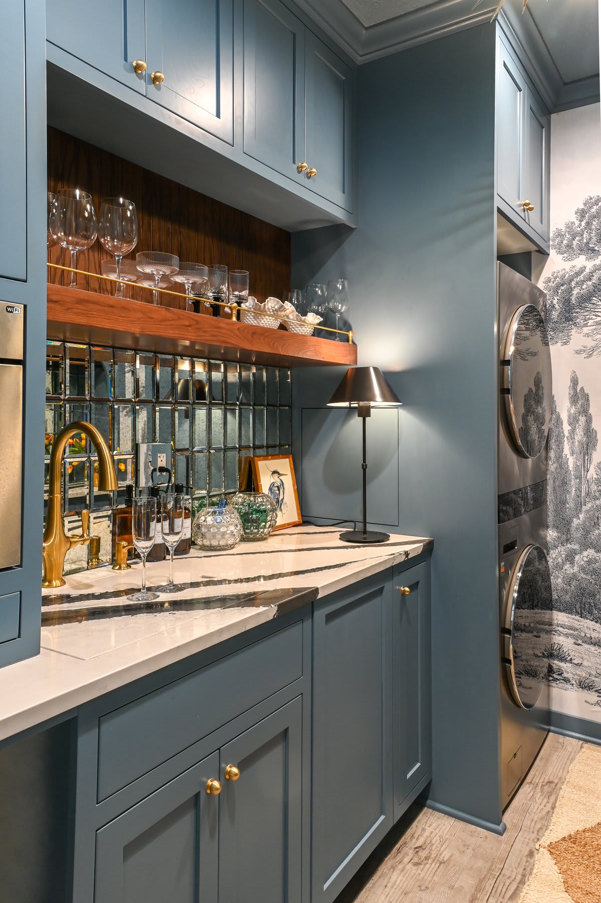Inspired by the old-school cocktail lounges found in New York City that manage to feel luxe, textured, and inviting even in the tiniest of spaces, she developed a mood board and color palette. Rethinking the configuration and enlisting the services of custom cabinet maker Regalwood Cabinets, she was able to make the small space serve as a laundry room and butler’s pantry, complete with an ice maker, dishwasher, coffee maker, and wet bar.