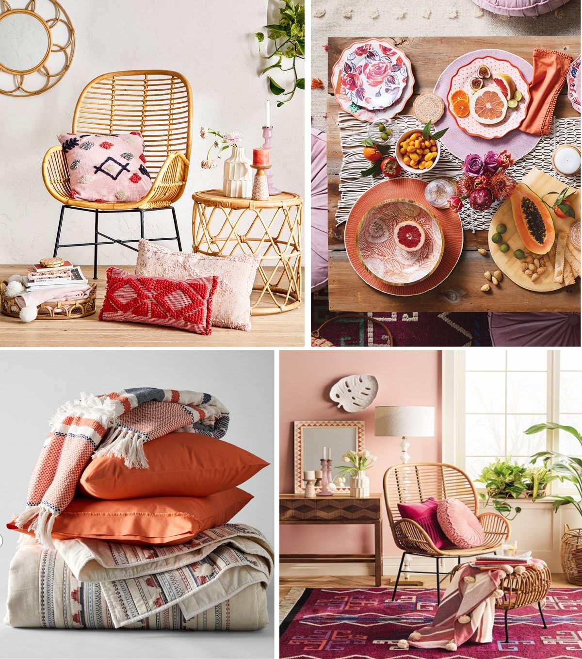 We’re loving this bright, bohemian vibe. Loads of pinks, oranges, and natural wood tones, with an effortlessly stylish feel. We’d love to create the perfect reading lounge with these pieces: